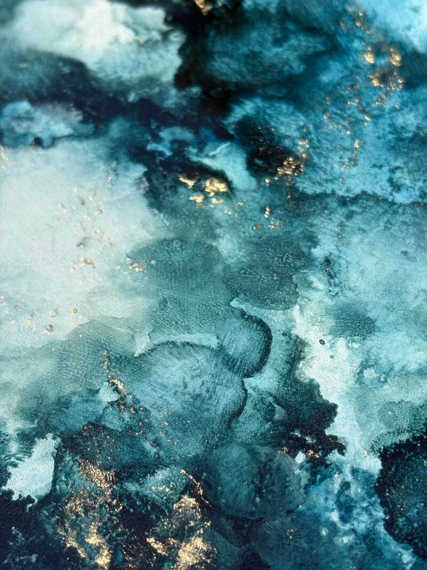 Diep groene tinten vermengen zich met witte en gouden accenten, waardoor een sfeer ontstaat die doet denken aan een sterrennacht of de mysterieuze diepte van de oceaan. Het is een kunstwerk dat rust brengt, maar tegelijk kracht uitstraalt.