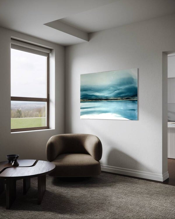 Laag over laag van inkt, acryl en diverse mediums vormt een rijke textuur die verandert met licht en perspectief, en de kijker actief deel laat nemen aan het werk. De 22k bladgouden horizon vangt het licht en symboliseert de spanning tussen kwetsbaarheid en kracht — een subtiel maar krachtig centraal element.